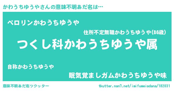 | 男性向けラノベタイトル風あだ名 | 『かわうちゆうや~年齢イコール彼女いない歴の魔法使い~』 |