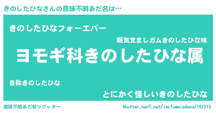 | 男性向けラノベタイトル風あだ名 | 『きのしたひな~年齢イコール彼女いない歴の魔法使い~』 |