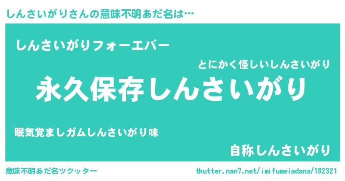 | 男性向けラノベタイトル風あだ名 | 『しんさいがりという概念が存在しない退屈な世界 』 |