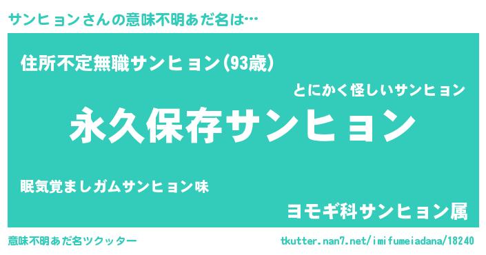 | 胡散臭い通販商品みたいなあだ名 | 『前代未聞の健康食品…その名も「サンヒョン」』 |