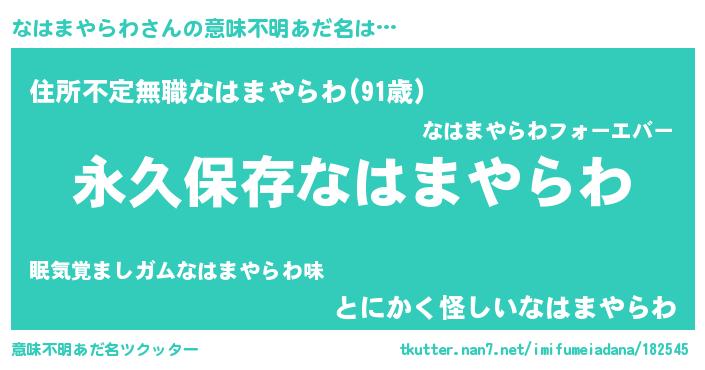 | 男性向けラノベタイトル風あだ名 | 『なはまやらわという概念が存在しない退屈な世界 』 |
