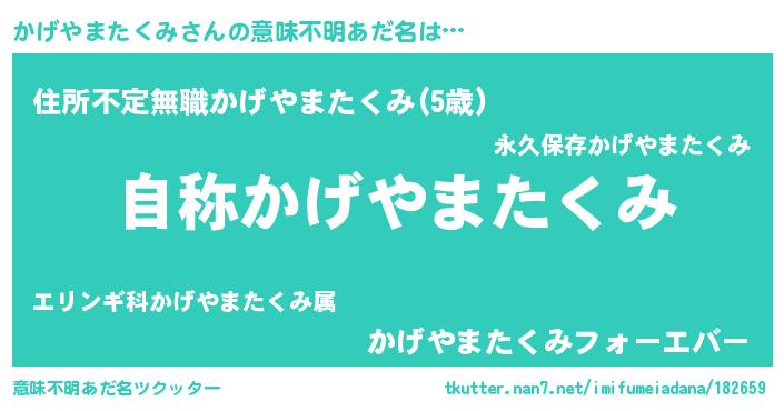 | 男性向けラノベタイトル風あだ名 | 『Re:かげやまたくみから始める異世界生活』 |