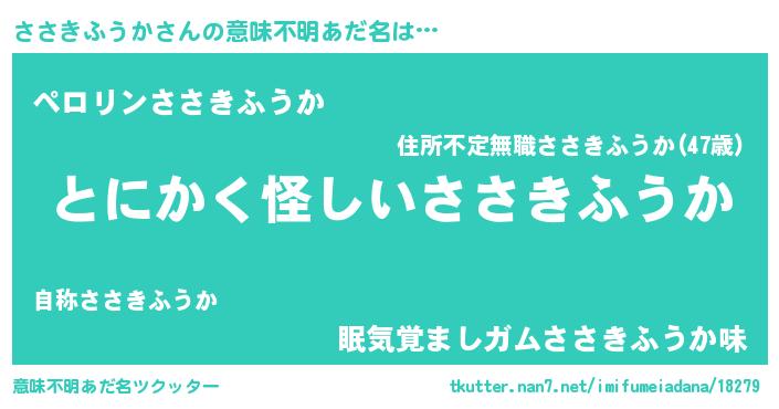 | 男性向けラノベタイトル風あだ名 | 『ささきふうかの嫁は女の子じゃないと思った?』 |