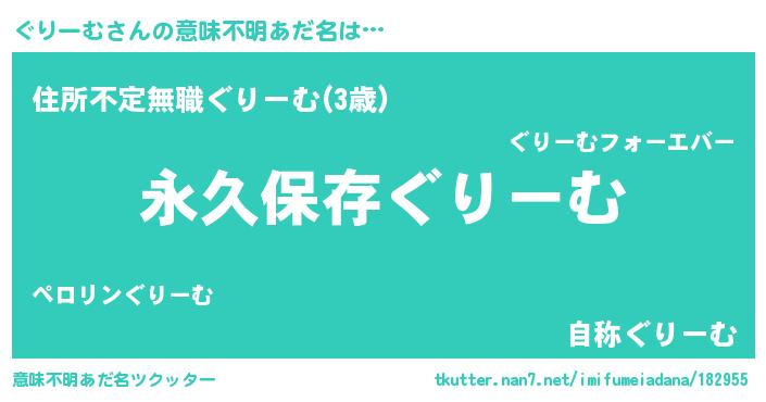 | 男性向けラノベタイトル風あだ名 | 『ぐりーむという概念が存在しない退屈な世界 』 |