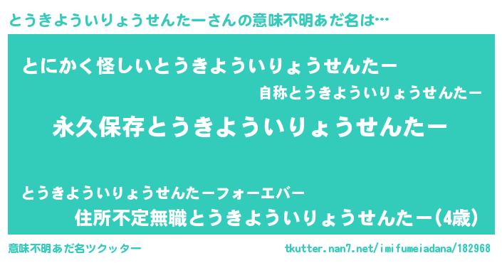| 胡散臭い通販商品みたいなあだ名 | 『来世でも幸せになれる健康食品…その名も「とうきよういりょうせんたー」』 |