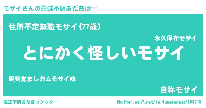 | 胡散臭い通販商品みたいなあだ名 | 『信頼と実績のサプリメント…その名も「モサイ」』 |