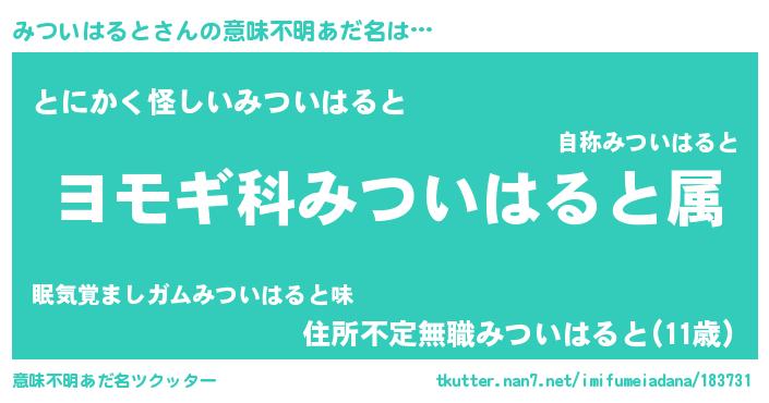 | 男性向けラノベタイトル風あだ名 | 『みついはると~年齢イコール彼女いない歴の魔法使い~』 |