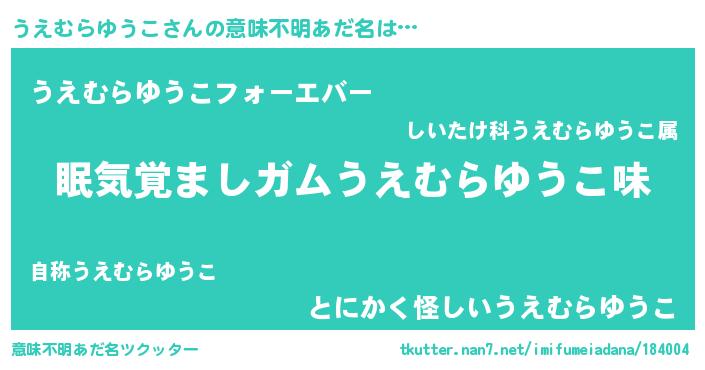 | 男性向けラノベタイトル風あだ名 | 『うえむらゆうこに滅ぼされるだけの簡単なお仕事です』 |
