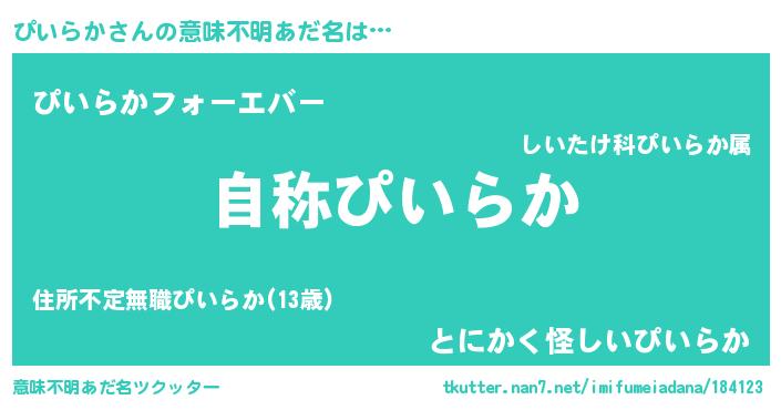 | 男性向けラノベタイトル風あだ名 | 『Re:ぴいらかから始める異世界生活』 |
