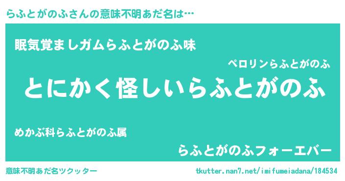 | 男性向けラノベタイトル風あだ名 | 『らふとがのふの嫁は女の子じゃないと思った?』 |