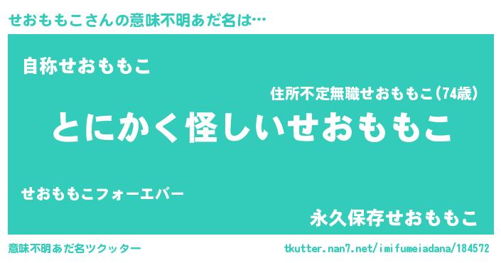 | 女子向けラノベタイトル風あだ名 | 『せおももこの卵を拾いまして』 |