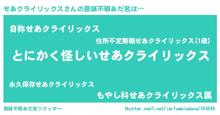 | 胡散臭い通販商品みたいなあだ名 | 『信頼と実績のサプリメント…その名も「せあクライリックス」』 |
