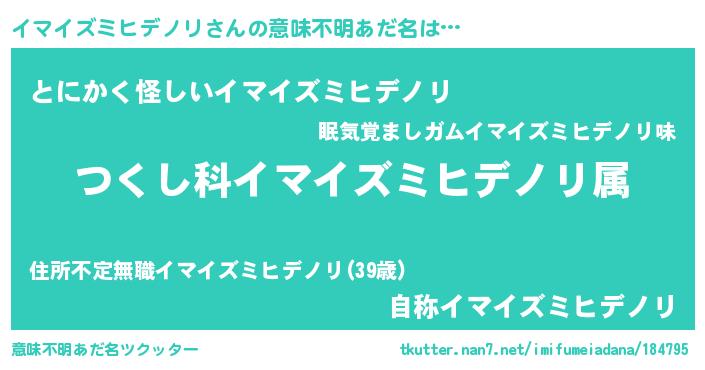 | 男性向けラノベタイトル風あだ名 | 『イマイズミヒデノリ~年齢イコール彼女いない歴の魔法使い~』 |