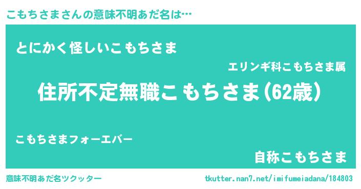 | 男性向けラノベタイトル風あだ名 | 『この素晴らしい世界にこもちさまを!』 |
