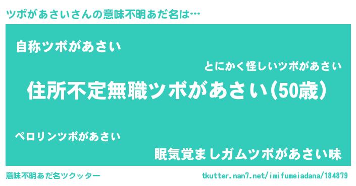 女子向けラノベタイトル風あだ名 | 『悪役ツボがあさいに転生したようですが、知った事ではありません』 |