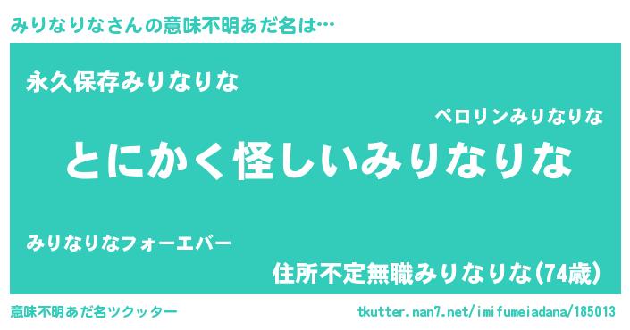 | 男性向けラノベタイトル風あだ名 | 『みりなりなの嫁は女の子じゃないと思った?』 |
