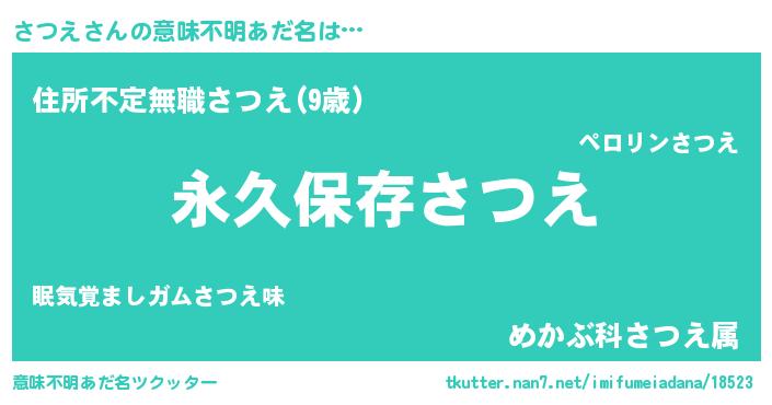 | 男性向けラノベタイトル風あだ名 | 『さつえという概念が存在しない退屈な世界 』 |