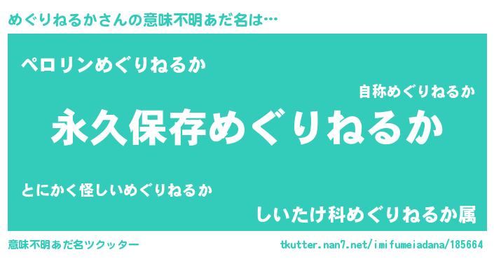 | 男性向けラノベタイトル風あだ名 | 『めぐりねるかという概念が存在しない退屈な世界 』 |