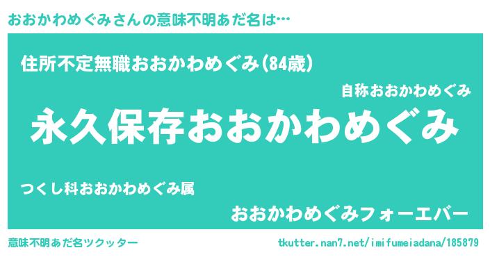 | 男性向けラノベタイトル風あだ名 | 『うちのおおかわめぐみが世界を掌握している!』 |