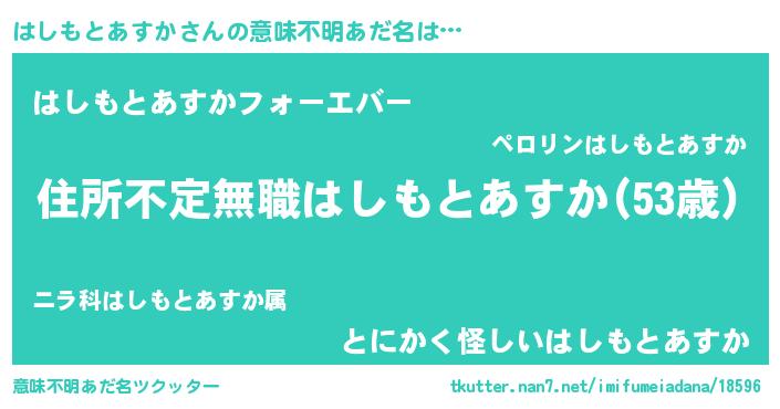 | 男性向けラノベタイトル風あだ名 | 『この素晴らしい世界にはしもとあすかを!』 |