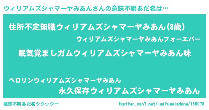 | 男性向けラノベタイトル風あだ名 | 『ノーゲーム・ノーウィリアムズシャマーヤミアン』 |
