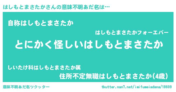 | 男性向けラノベタイトル風あだ名 | 『はしもとまさたかの嫁は女の子じゃないと思った?』 |