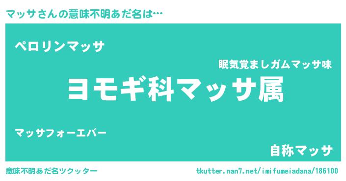 | 男性向けラノベタイトル風あだ名 | 『マッサ~年齢イコール彼女いない歴の魔法使い~』 |