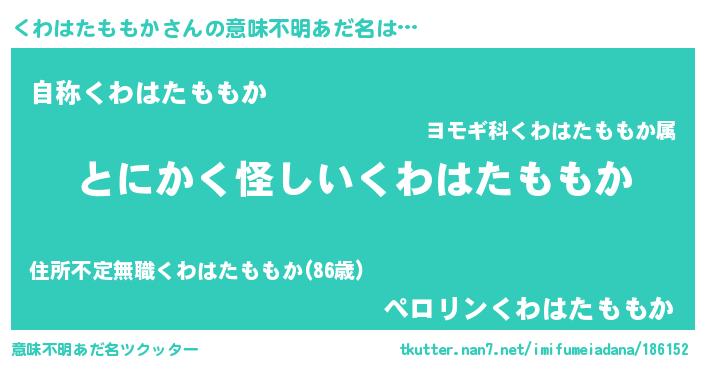 | 男性向けラノベタイトル風あだ名 | 『くわはたももかに滅ぼされるだけの簡単なお仕事です』 |