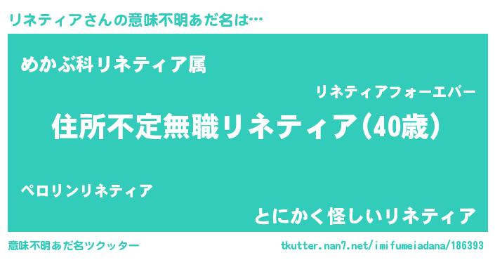 | 男性向けラノベタイトル風あだ名 | 『この素晴らしい世界にリネティアを!』 |