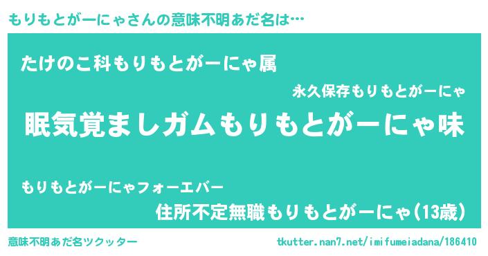 | ヘコむあだ名 | 『もりもとがーにゃ(遠い目)』『豆乳』 |