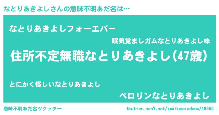 | 男性向けラノベタイトル風あだ名 | 『魔弾の王となとりあきよし』 |