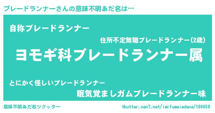 | 男性向けラノベタイトル風あだ名 | 『ブレードランナー~年齢イコール彼女いない歴の魔法使い~』 |