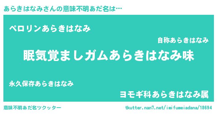 | 男性向けラノベタイトル風あだ名 | 『おまえをオタクにしてやるから、俺をあらきはなみにしてくれ! 』 |