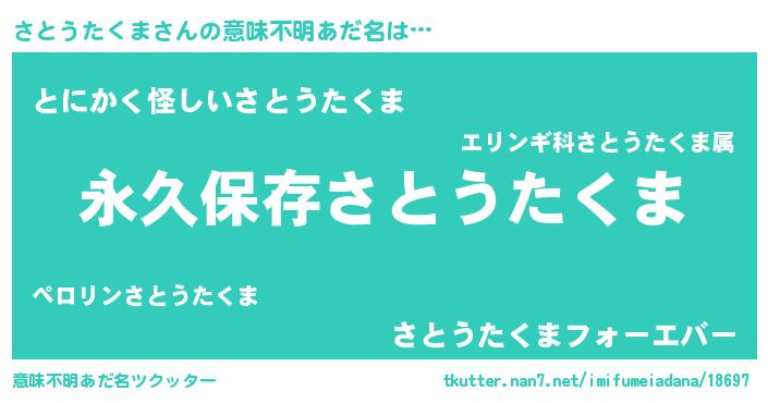 | 胡散臭い通販商品みたいなあだ名 | 『絶対に幸福をもたらす水素水…その名も「さとうたくま」』 |