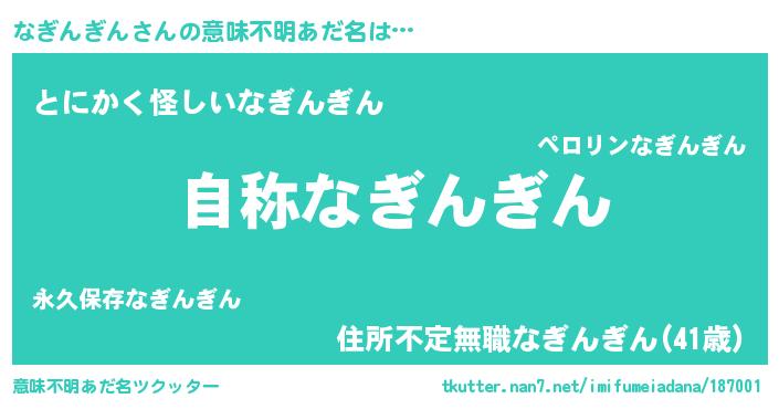 | 男性向けラノベタイトル風あだ名 | 『Re:なぎんぎんから始める異世界生活』 |