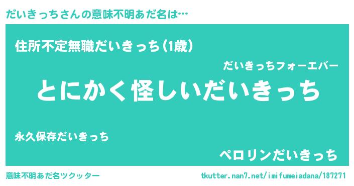 | 男性向けラノベタイトル風あだ名 | 『だいきっちの嫁は女の子じゃないと思った?』 |