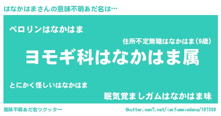 | 男性向けラノベタイトル風あだ名 | 『はなかはま~年齢イコール彼女いない歴の魔法使い~』 |