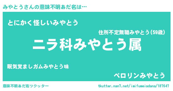 | 男性向けラノベタイトル風あだ名 | 『みやとう~年齢イコール彼女いない歴の魔法使い~』 |