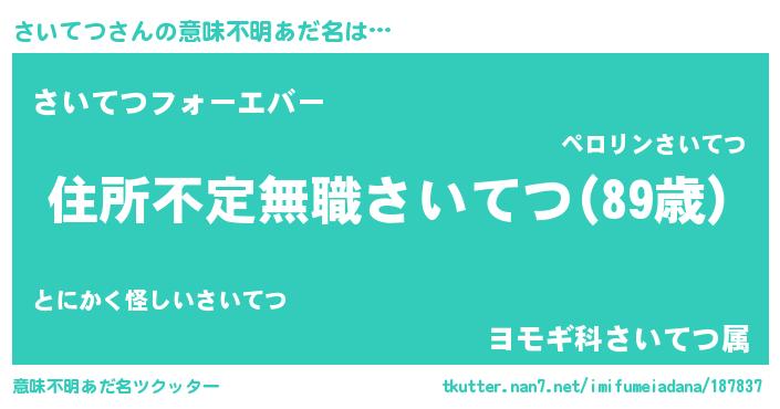 | 男性向けラノベタイトル風あだ名 | 『この素晴らしい世界にさいてつを!』 |