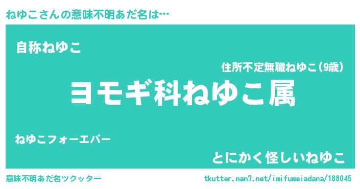 | 欧米人風あだ名 | 『ねゆこ・ステッグマイヤー』 |