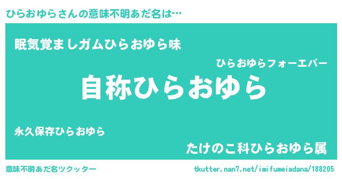 | 男性向けラノベタイトル風あだ名 | 『Re:ひらおゆらから始める異世界生活』 |
