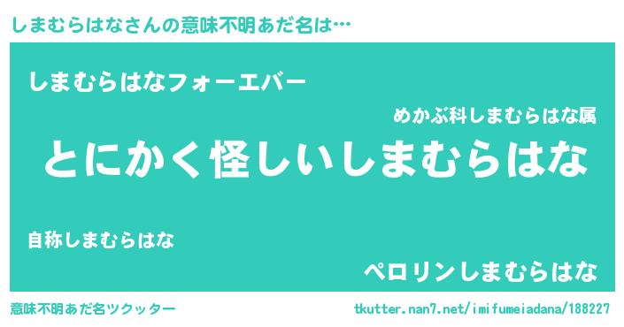 | 男性向けラノベタイトル風あだ名 | 『しまむらはなの嫁は女の子じゃないと思った?』 |