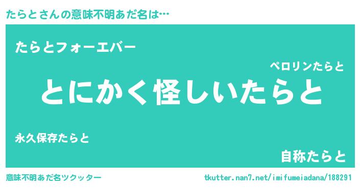 | 男性向けラノベタイトル風あだ名 | 『たらとに滅ぼされるだけの簡単なお仕事です』 |