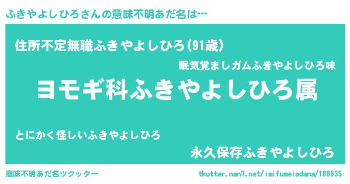 | 男性向けラノベタイトル風あだ名 | 『ふきやよしひろ~年齢イコール彼女いない歴の魔法使い~』 |