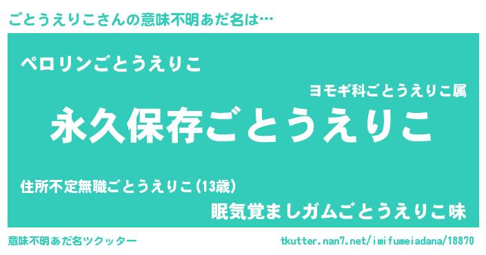 | 胡散臭い通販商品みたいなあだ名 | 『来世でも幸せになれる水素水…その名も「ごとうえりこ」』 |