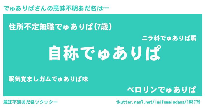 | 男性向けラノベタイトル風あだ名 | 『Re:でゅありぱから始める異世界生活』 |