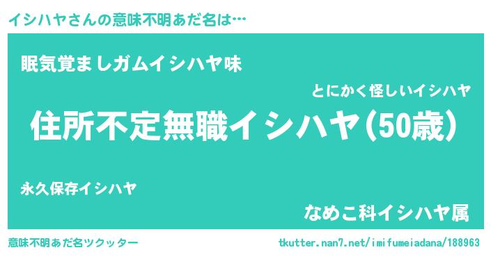 | ヒーロー風カッコイイあだ名 | 『仮面イシダー』『慈愛の使者イシハヤ』 |
