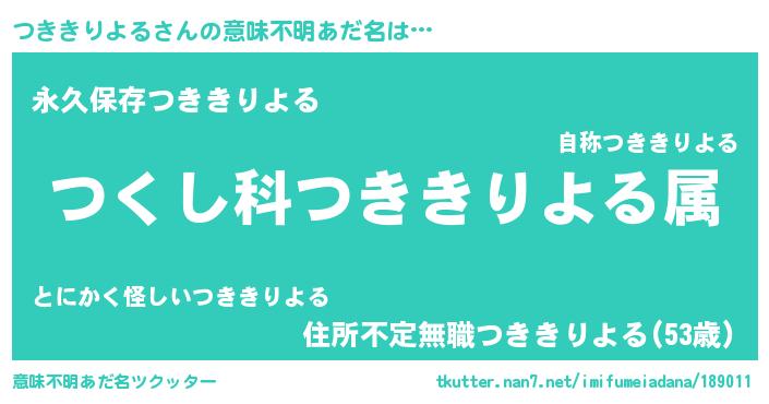 | 男性向けラノベタイトル風あだ名 | 『つききりよる~年齢イコール彼女いない歴の魔法使い~』 |