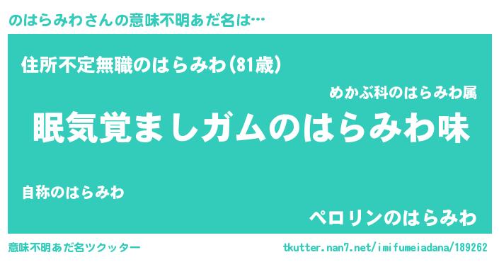 | ヒーロー風カッコイイあだ名 | 『慈愛の使者のはらみわ』『仮面ノハダー』 |