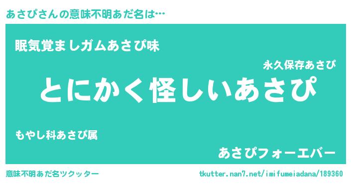 | 女子向けラノベタイトル風あだ名 | 『あさぴ様がみてる』『あさぴ伯爵の花嫁』 |